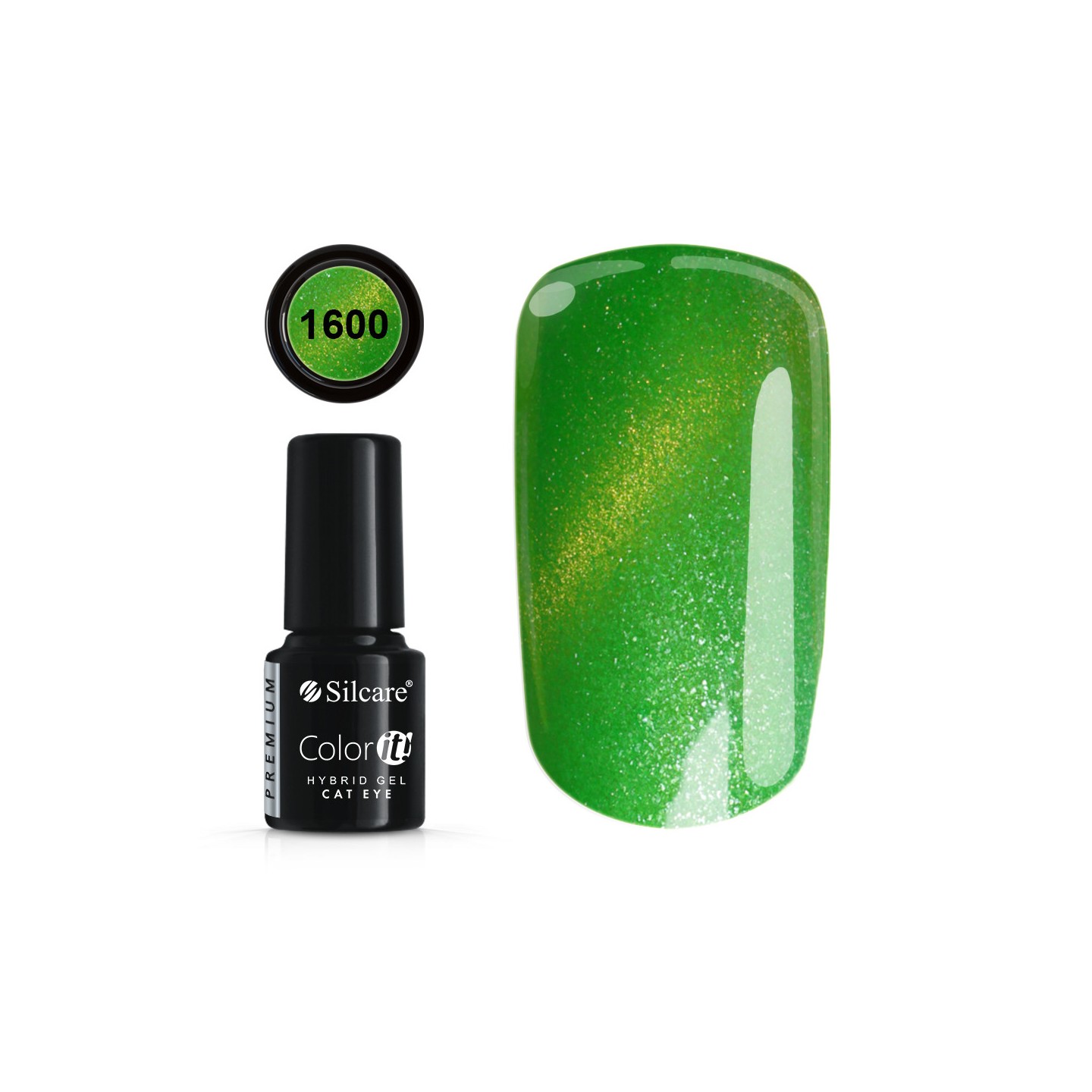 Maak kennis met de serie Color It hybride vernissen, die verrukken met hun intensiteit en verzadiging. Met de Cat Eye-serie kunt u met behulp van een speciale magneet een onaards effect op de nagels creëren, dat met zijn diepte lijkt op een kattenoog. Kies je favoriete tint uit de Color It Cat Eye-serie en verras iedereen met een ongewone stilering. Niemand zal je onverschillig voorbijgaan. Shade 1600 is een goddelijk glinsterende felgroene kleur met een delicate limoenglitter.