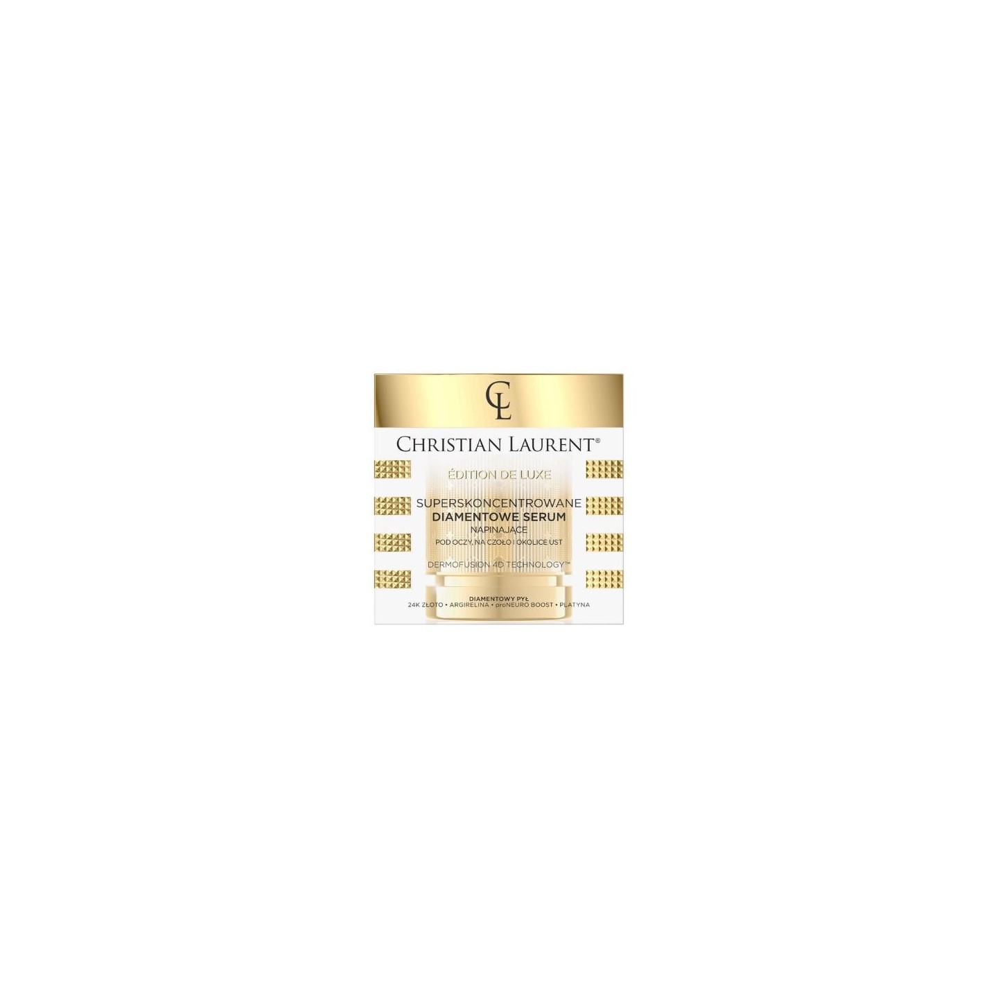Сироватка для зміцнення шкіри Diamond Firming Serum – це потрійно концентрована формула, яка має потужний розгладжуючий та зміцнюючий ефект, ефективно розслаблюючи мімічні зморшки навколо очей та рота. Вона миттєво створює зміцнюючу мікросітку на поверхні шкіри, зменшуючи появу зморшок та дрібних ліній. Вона допомагає зменшити появу «гусячих лапок», темних кіл під очима та зморшок навколо рота, відновлюючи молодий та відпочивший вигляд. Алмазний пил сприяє омолодженню шкіри, підтримує регенерацію та делікатно освітлює її. 24-каратне золото має зміцнюючі, протизморшкові та глибоко зволожувальні властивості. Аргірелін та комплекс proNeuro Boost розслаблюють м’язи обличчя, забезпечуючи негайний ліфтинг та зміцнюючий ефект. Платина вирівнює тон шкіри, живить та розгладжує її.
