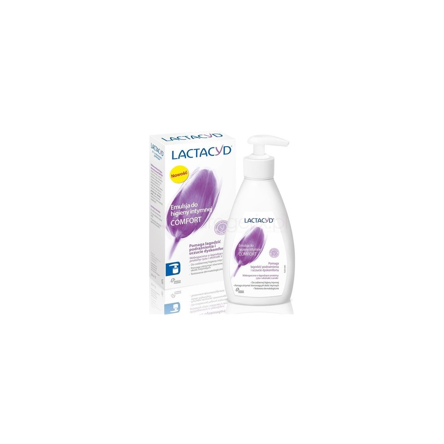 Делікатна емульсія для Засоби для інтимної гігієни Lactacyd Comfort створені для заспокоєння та полегшення при дискомфорті, такому як печіння або свербіж. Його делікатна формула не містить мила та збагачений натуральною L-молочною кислотою, протеїнами рису та екстрактом арніки, відомого своїми протизапальні та заспокійливі властивості.