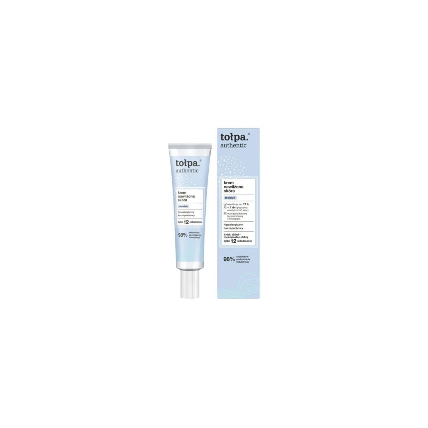 Tołpa Authentic Face cream moisturized skin — справжній порятунок для зневодненої та спраглої шкіри. Завдяки сквалану він зволожує протягом 72 годин і відновлює. За 7 днів покращує еластичність і повертає гладкість. Завдяки Легка формула, що швидко вбирається, відновлює гідроліпідний шар епідермісу, не обтяжуючи його і не роблячи блискучою. М’яко живить шкіру, заспокоює її і не порушує природний рН.