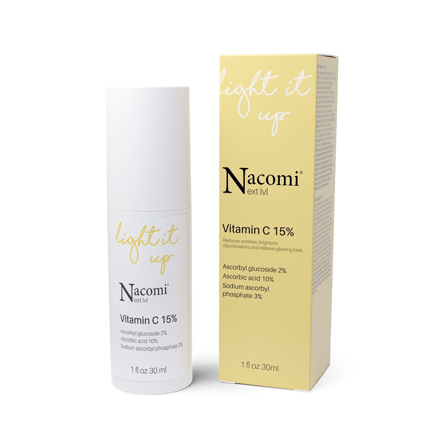 Вітамін С допомагає надати природного та сяючого блиску тьмяній, сірій та втомленій шкірі з нерівномірним кольором. У поєднанні з олією шипшини освітлює зміни кольору, зміцнює еластичність шкіри та допомагає ущільнити стінки кровоносних судин, запобігаючи їх розриву. Формула, збагачена олією солодкого мигдалю, глибоко живить і стимулює природні процеси регенерації епідермісу. Мигдальна олія додатково зміцнює та зволожує шкіру, захищає її від негативних зовнішніх факторів.