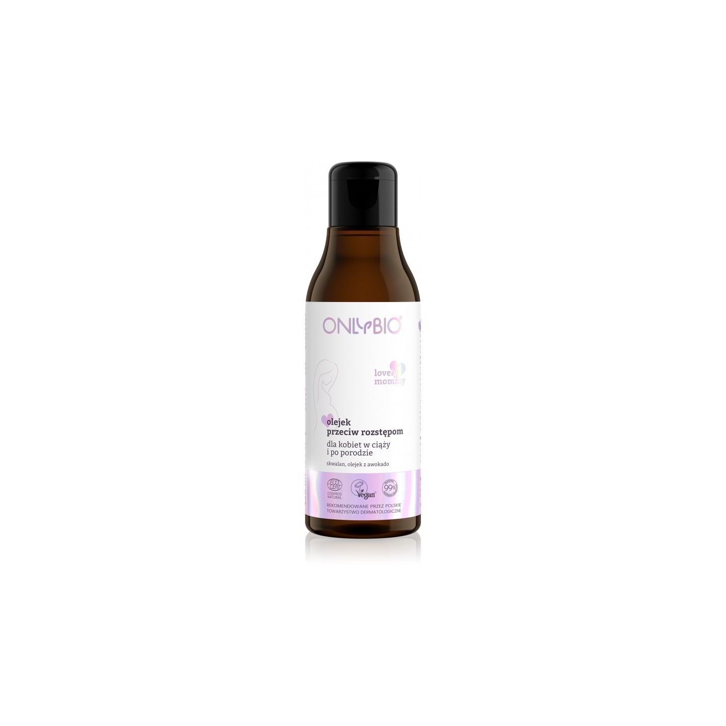 Олія від розтяжок Lovely Mommy від Onlybio легко наноситься і швидко вбирається, а її регулярне використання приносить найкращі результати. Має простий склад - 99% речовин, що містяться в ньому, мають природне походження. Водночас продукт повністю веганський і не містить жорстокості , що підтверджено Vegan Society. Рекомендовано Польським дерматологічним товариством і нагороджено сертифікатом Cosmos Natural від Ecocert Greenlife, який присуджується натуральній косметиці, що відповідає високим стандартам якості.